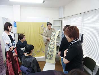 今回は、琉球紅型の作品について、琉装の衣装や、様々な資料と共に、制作工程をご説明しながら、作品に触れていただきました。