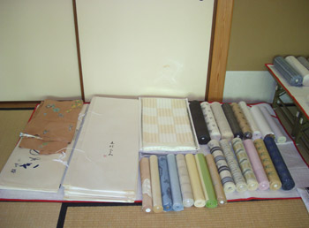 新垣氏制作・様々な裂地に触れて質感を見ていただく
